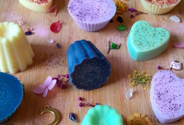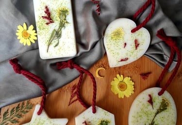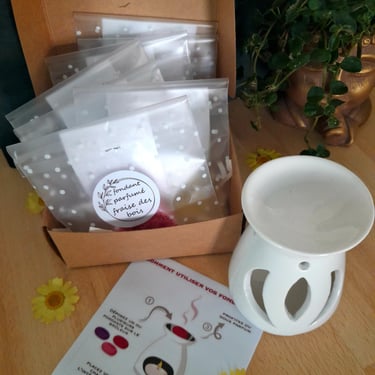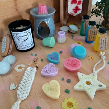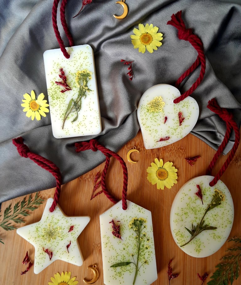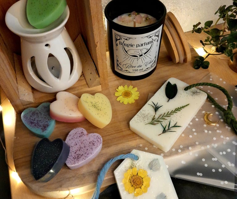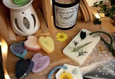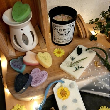 Bougies artisanales aux fleurs séchées, parfum de Grasse et pierres naturelles, fondants pour parfumer vos intérieurs, suspensions parfumées et coffrets cadeaux