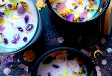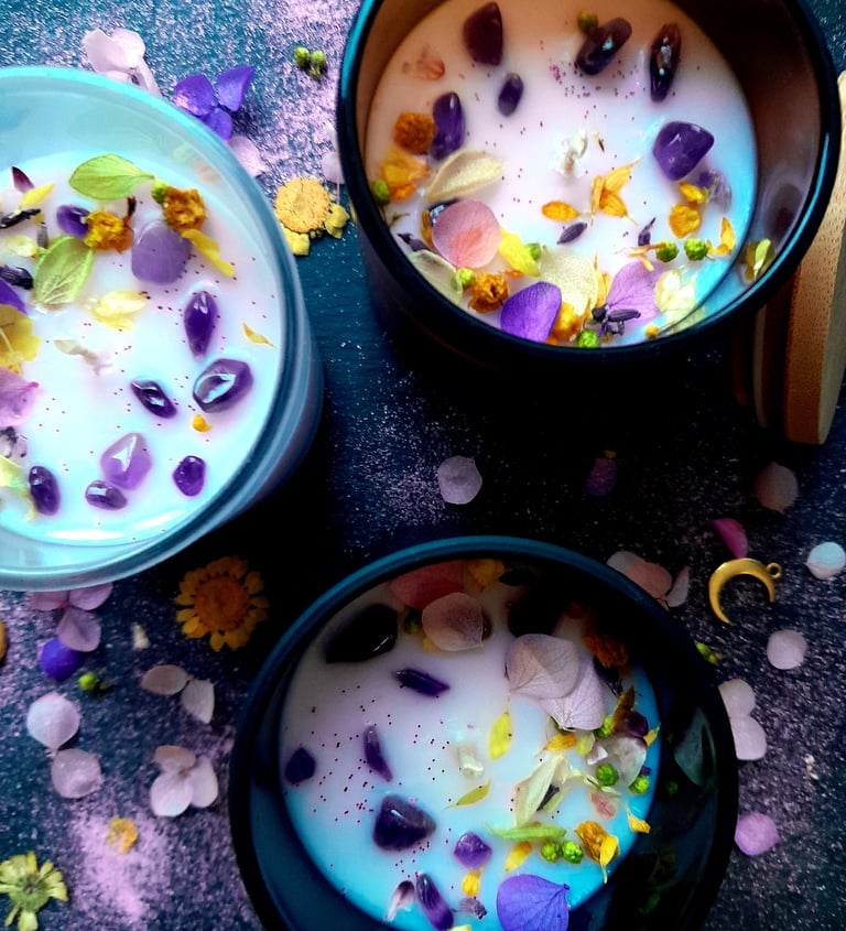 Bougies artisanales avec fleurs séchées et pierres naturelles.