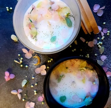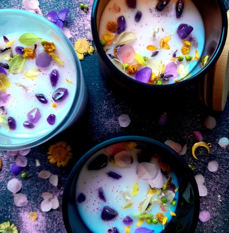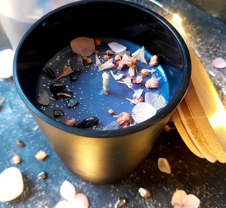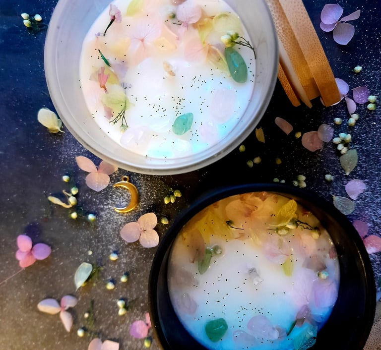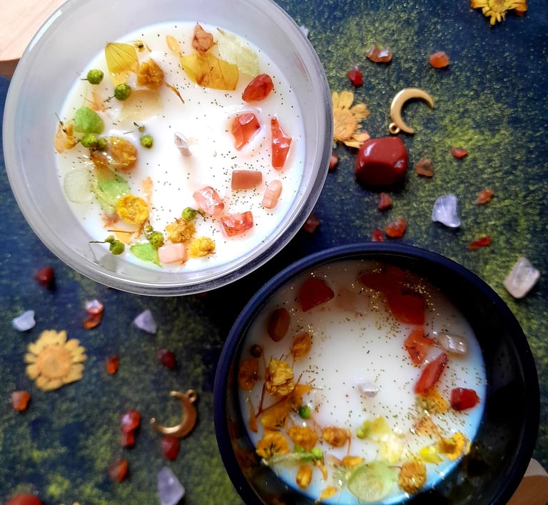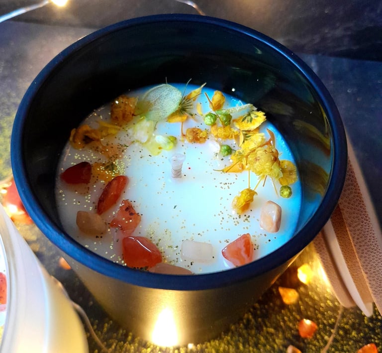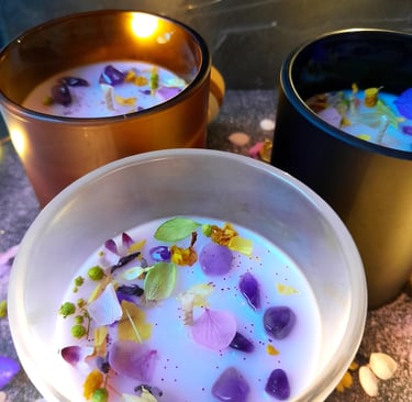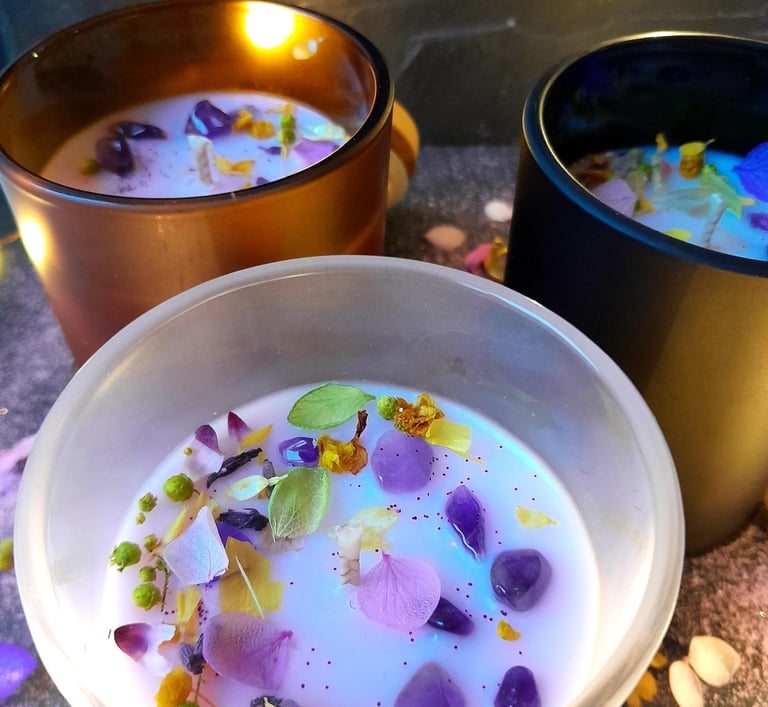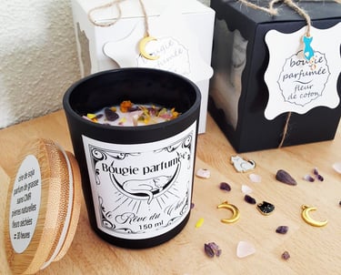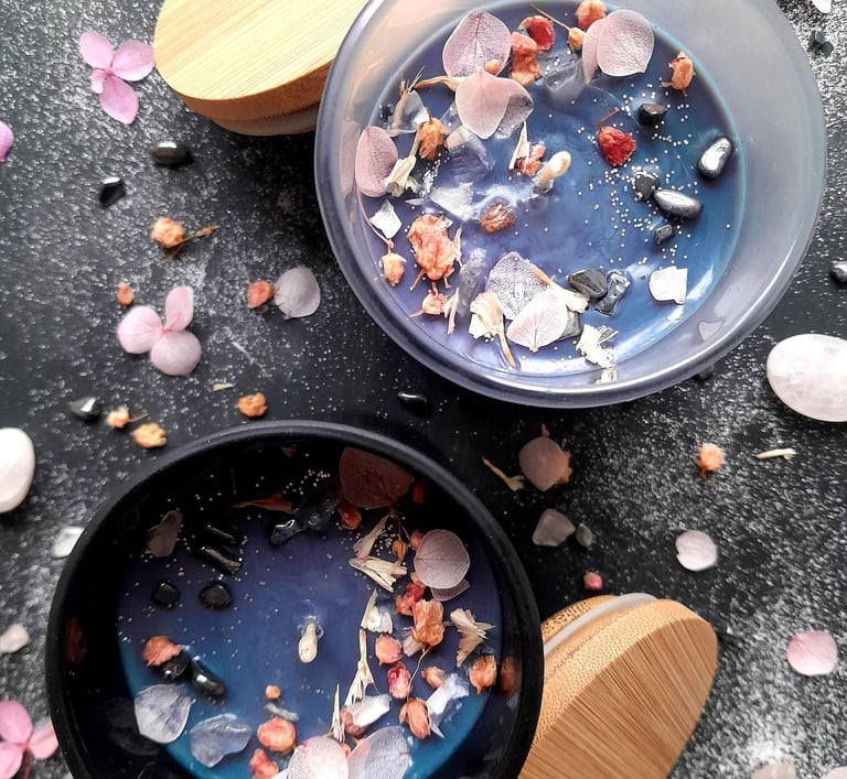 Chaque bougie est façonnée à la main avec des fleurs séchées et des pierres naturelles pour une ambiance chaleureuse et apaisante.
