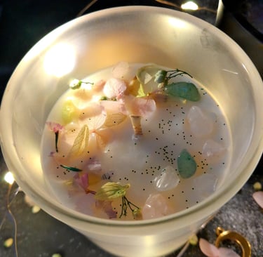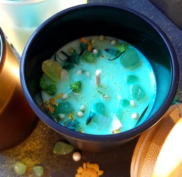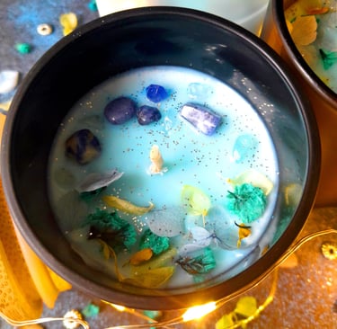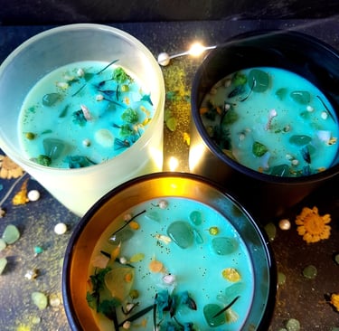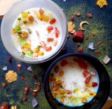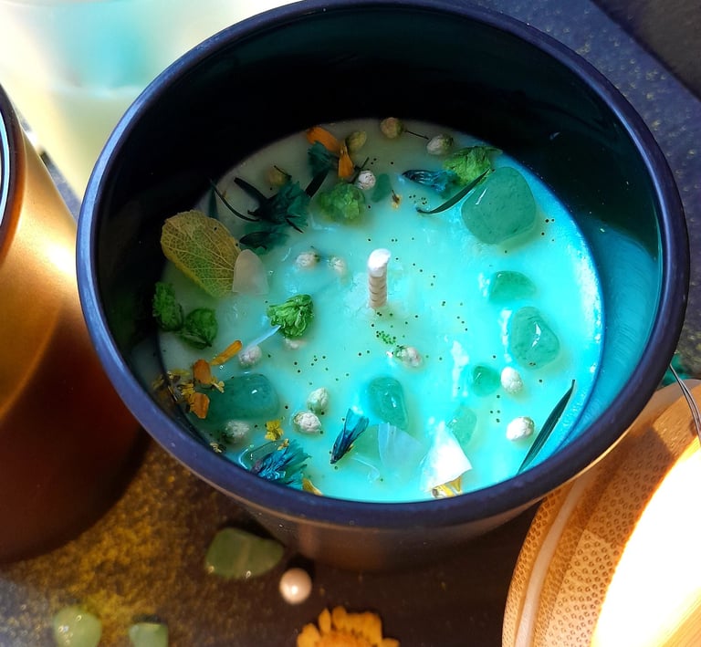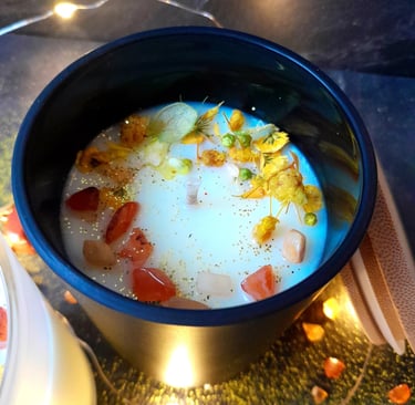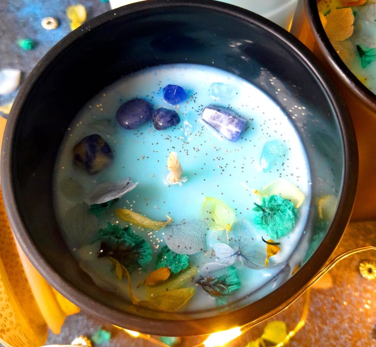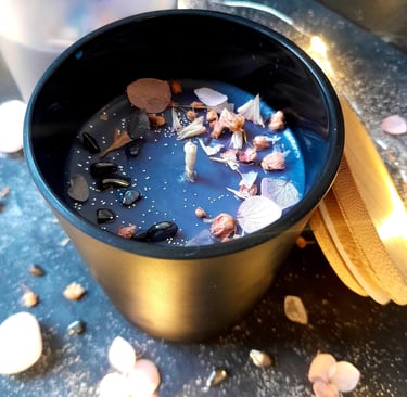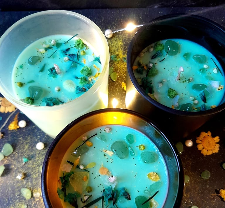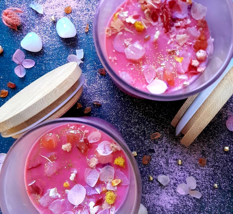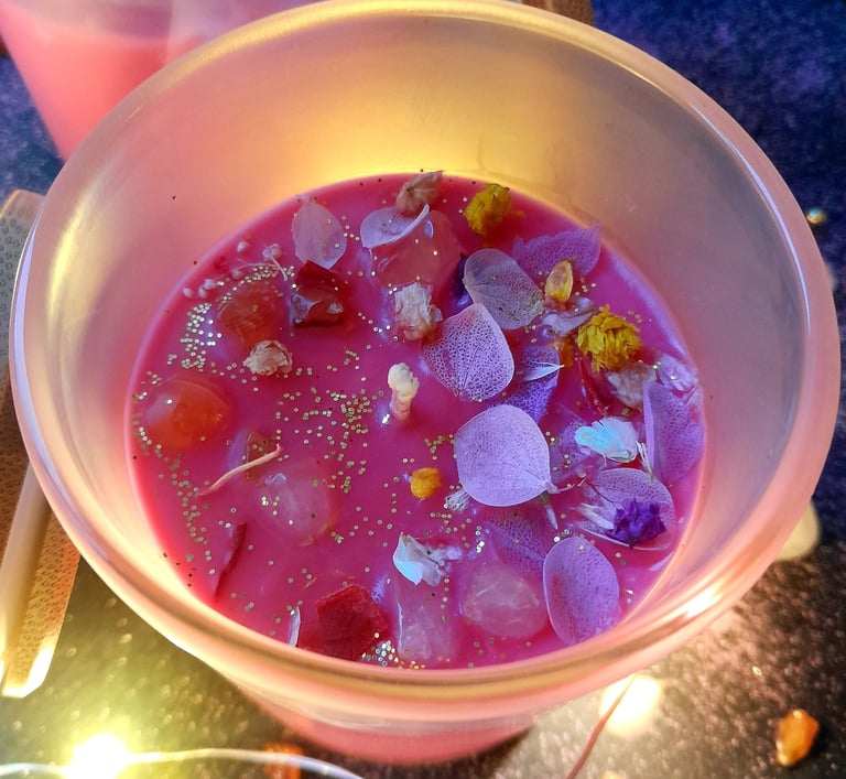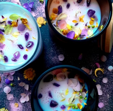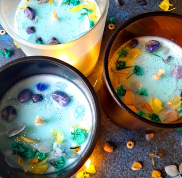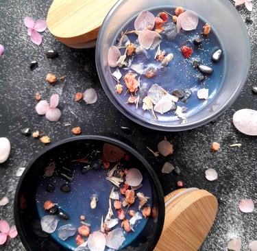 Chaque bougie est façonnée à la main avec des fleurs séchées et des pierres naturelles pour une ambiance chaleureuse et apaisante.