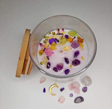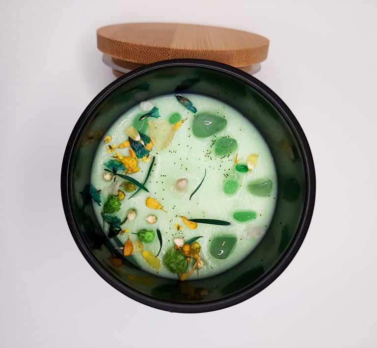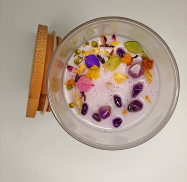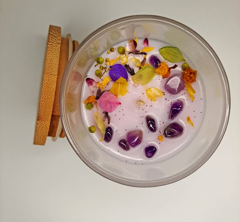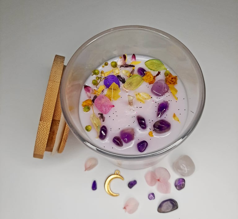Chaque bougie est façonnée à la main avec des fleurs séchées et des pierres naturelles, pour une ambiance chaleureuse et apaisante.