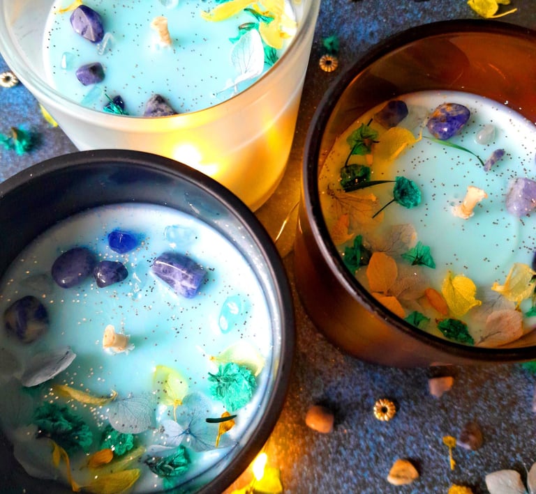 Bougies artisanales mêlant fleurs séchées et pierres naturelles.